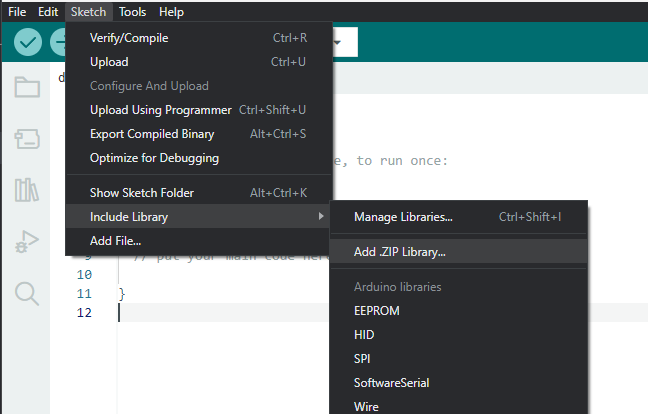 - In the Arduino IDE, go to Sketch → Include Library → Add .ZIP Library…
