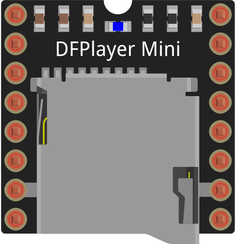 The ESP32 has too little memory to load and play audio files. Instead, we use a separate device to store and manage the audio media: The DFPlayer Mini is a small MP3 module that connects to an ESP32 (or other microcontrollers) over UART.