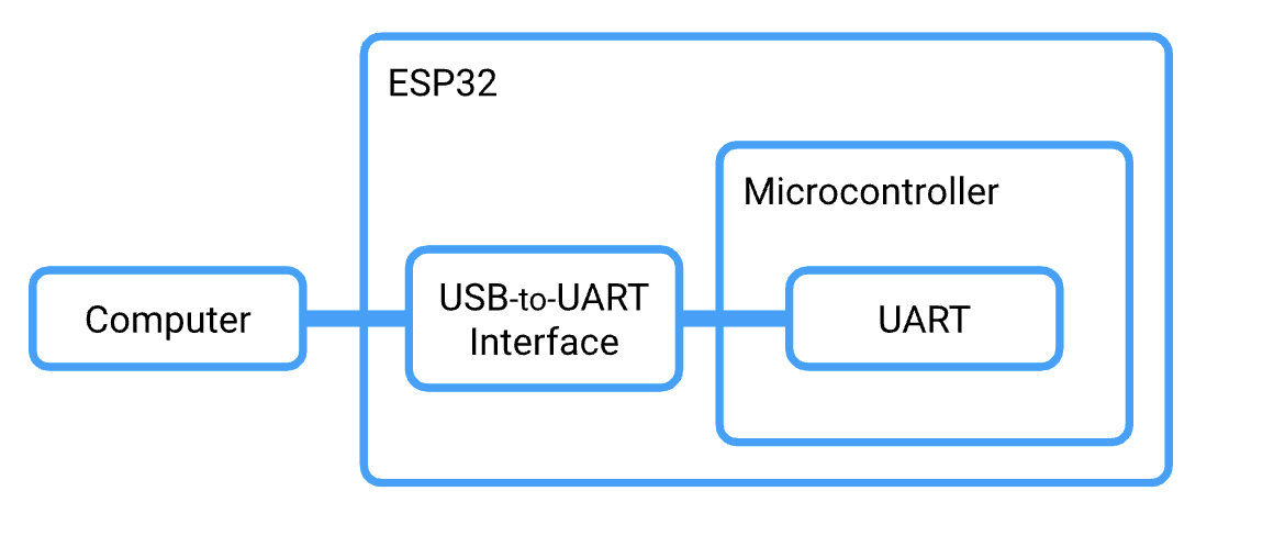 Hidden behind the scenes is the UART. Data is transmitted between the computer and ESP32 through a chip that converts USB signals to UART signals. Those converted signals are then transmitted to and from the UART within the ESP32's microcontroller.