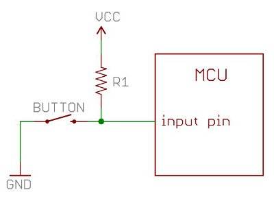 The solution is what we call a pull-up resistor. The input pin is connected to a high-value resistor R1 whose other terminal is attached to VCC (as depicted below).