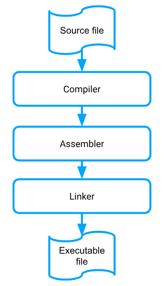 The assembler converts the assembly language into machine code. We’re not done, though! One last program called a linkertakes the machine code files and “links” them together into an executable file. You might recognize executables as files with the “.exe” extension on Windows. The executable is ultimately what the computer uses to execute your program.